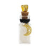 Een glazen flesje gevuld met getrommelde witte maansteen steentjes, gecombineerd met een messing maan-bedel. Wordt geleverd met een koord om te dragen of op te hangen als decoratief amulet.