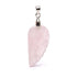 Fijn hangertje in de vorm van een engelenvleugel, gemaakt van natuurlijke rozenkwarts. Voorzien van een klein metalen oogje om aan een ketting of sleutelhanger te bevestigen.